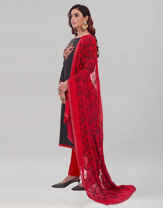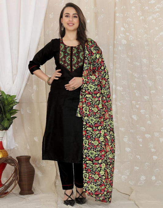 Black Cotton Embroidery Straight Kurta With Pant And Dupatta