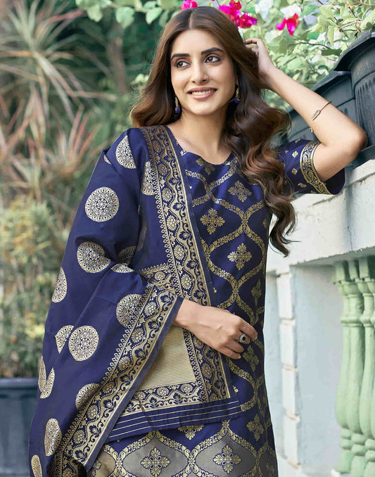 Navy Blue Woven Silk Straight Kurta With Pant And Dupatta
