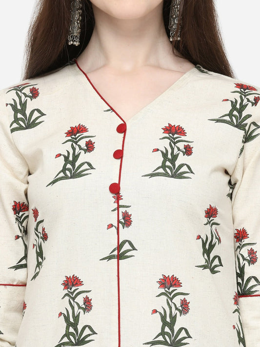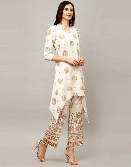 Off White Coloured Cotton Table Printed Kurti With Palazzo