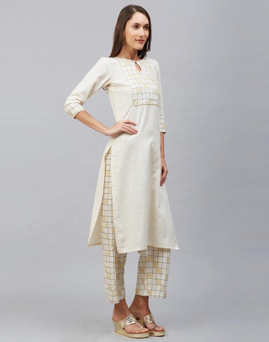 Off White Cotton V-neck gathered Kurta With Pant Set