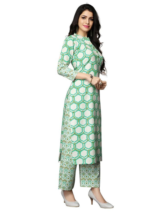 Off White Printed Cotton Straight Kurta With Pant And Dupatta