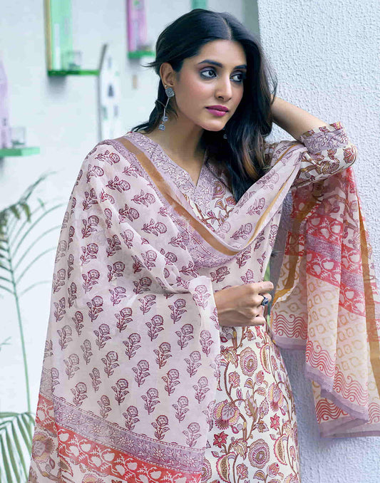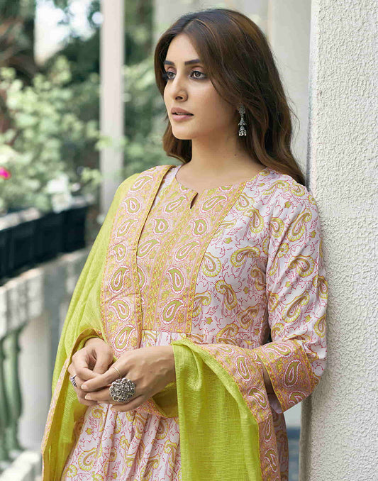 Off White Printed Rayon Flared Kurta With Pant And Dupatta