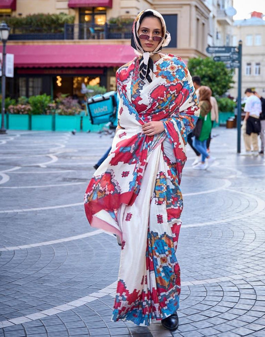 Off White Printed Silk Saree