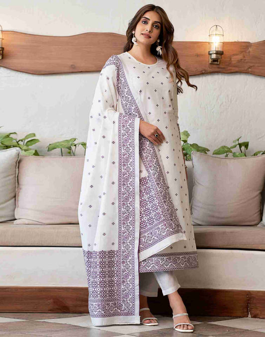 Off White Woven Cotton Straight Kurta Set With Dupatta