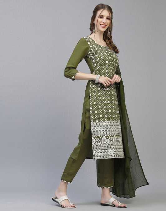 Olive Green Embroidered Kurta With Pant And Dupatta