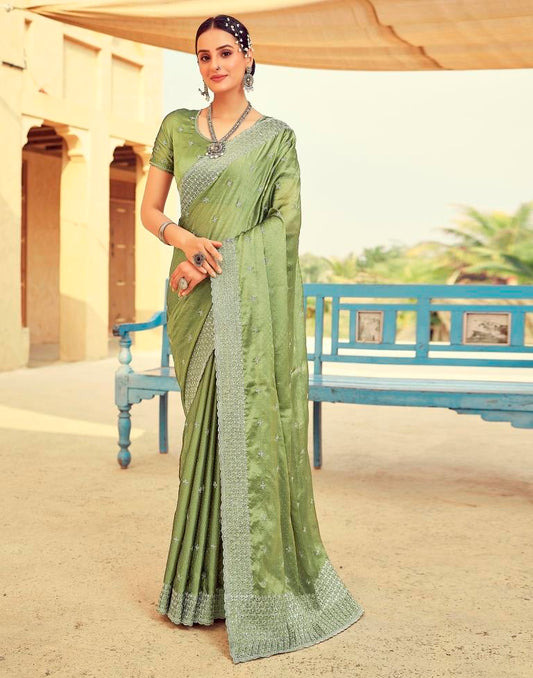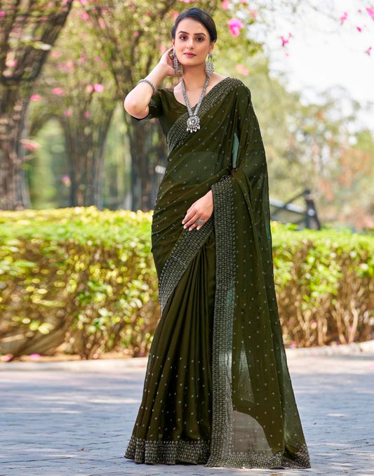 Olive Green Heavy Chiffon Printed Wth Sequence Saree
