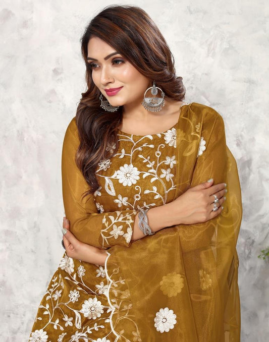 Olive Green Embroidery Silk Straight Kurta With Pant And Dupatta