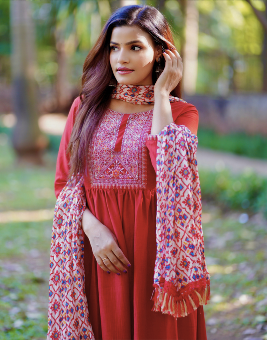 Orange Embroidery Flared Kurta With Pant And Dupatta