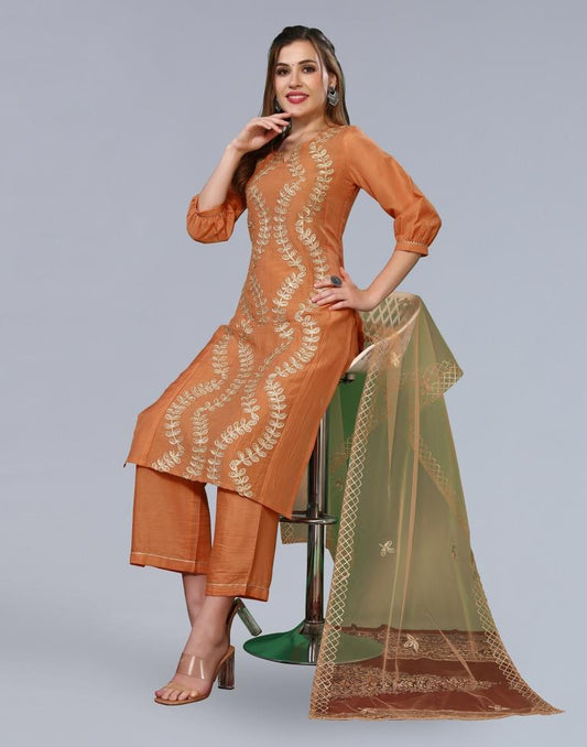 Orange Embroidery Chinnon Straight Kurta With Pant And Dupatta