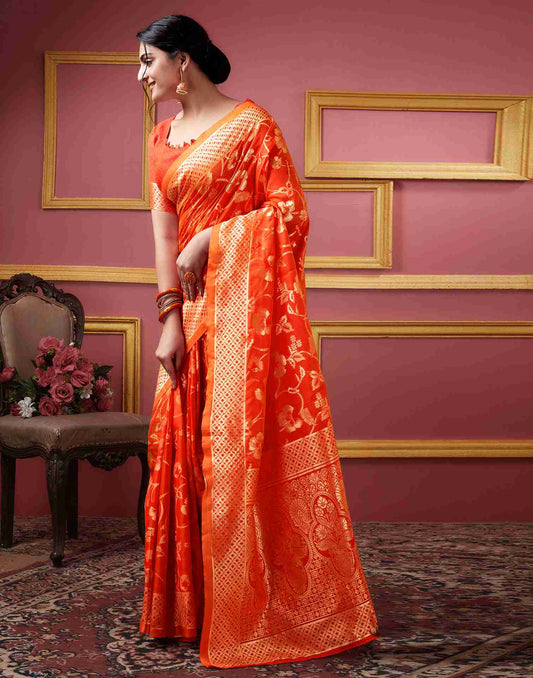 Orange Floral Banarasi Silk Saree