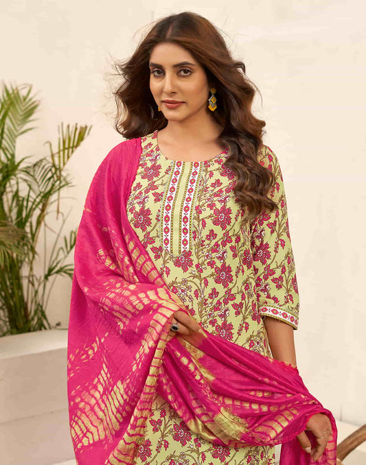 Pale Olive Green Printed Rayon Straight Kurta With Pant And Dupatta