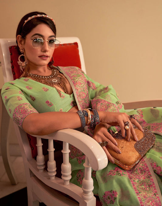 Parrot Green Coloured Poly Cotton Prined Casual saree
