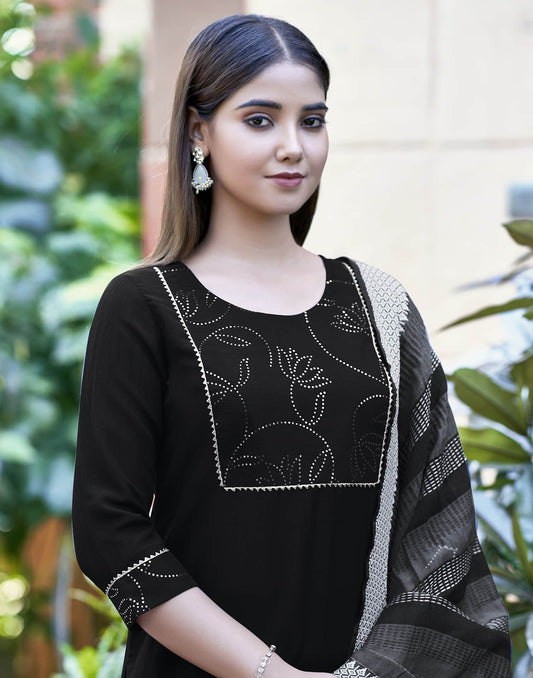 Black Embroidery Cotton Straight Kurta With Pant And Dupatta