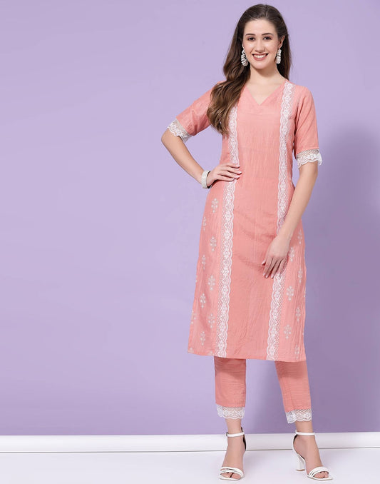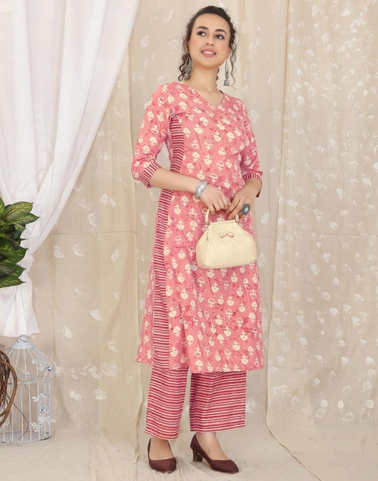 Peach Printed Cotton Kurti With Pant And Dupatta