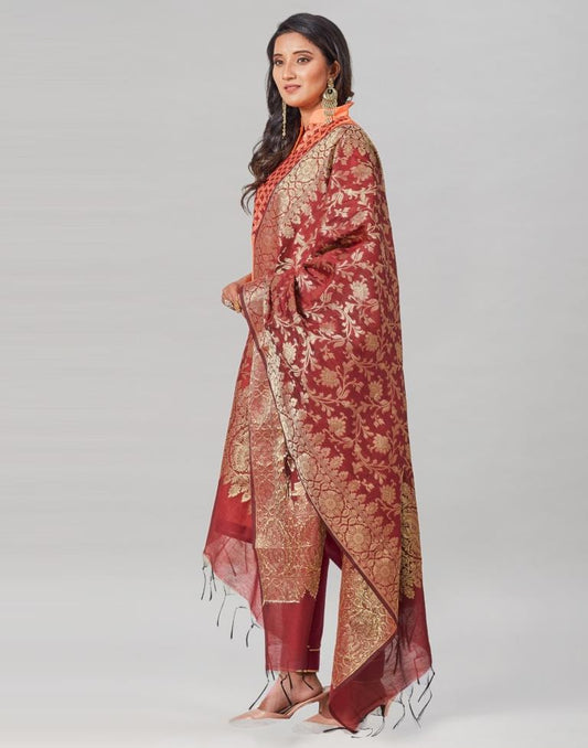 Peach Satin Woven Banarasi Saree