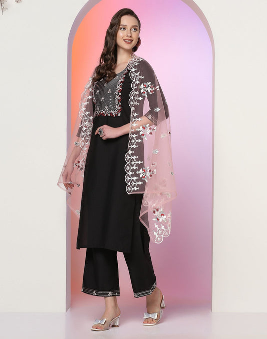Black Embroidery Silk A-Line Kurta With Pant And Dupatta
