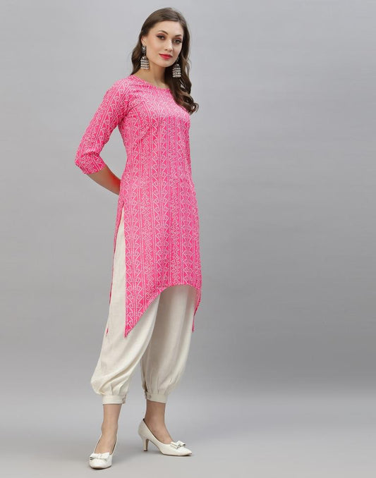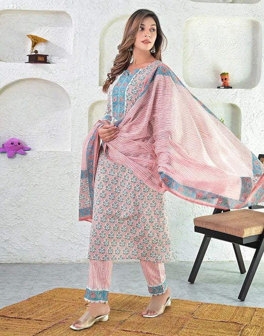 Pink Digital Printed Cotton Kurta With Pant And Dupatta