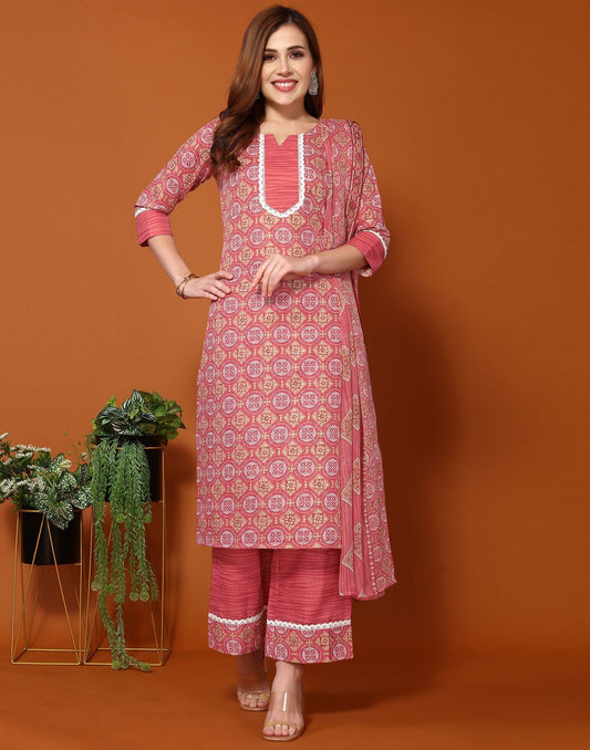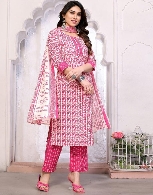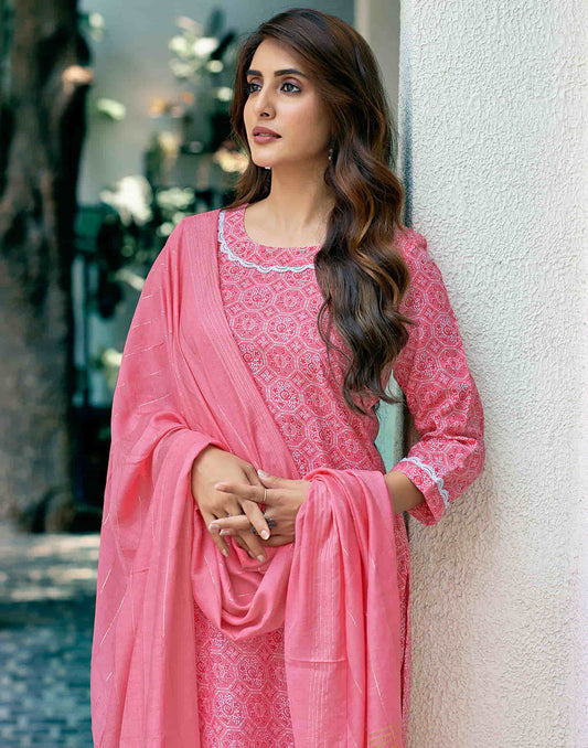 Pink Printed Cotton Straight Kurta With Pant And Dupatta