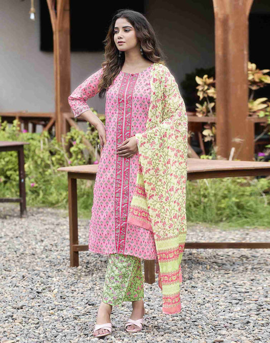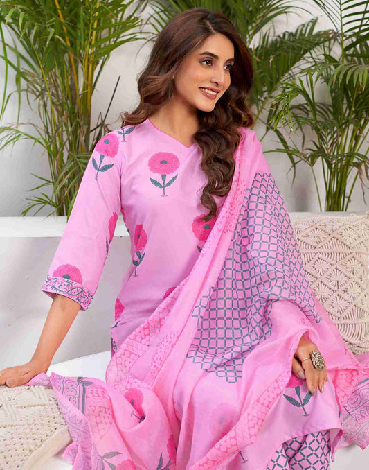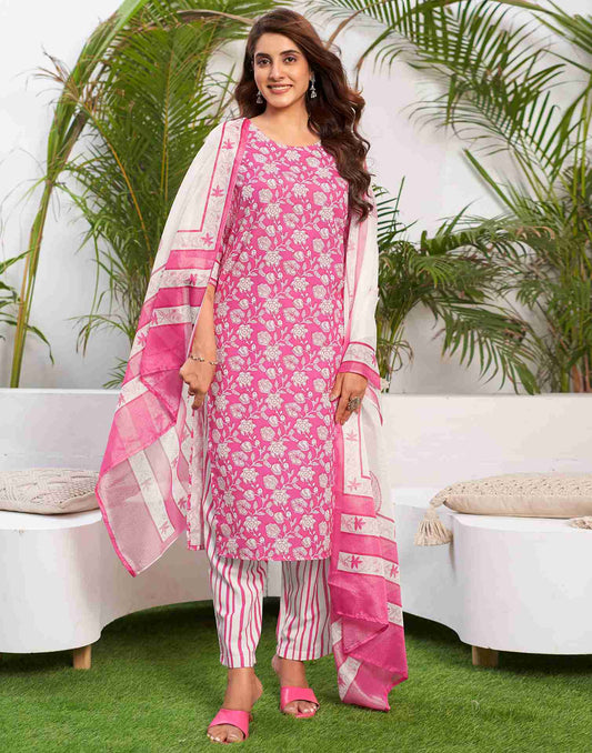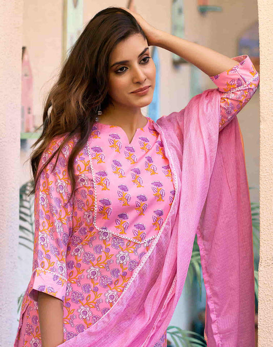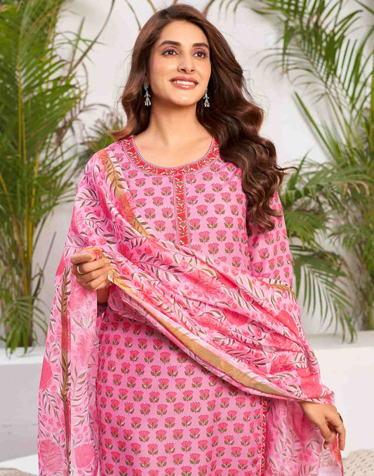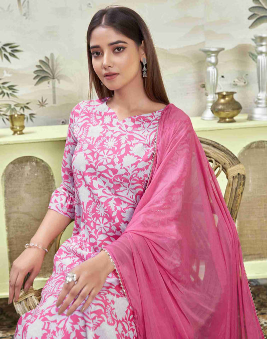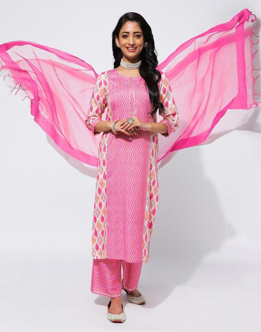 Pink Printed Rayon Straight Kurta With Pant And Dupatta