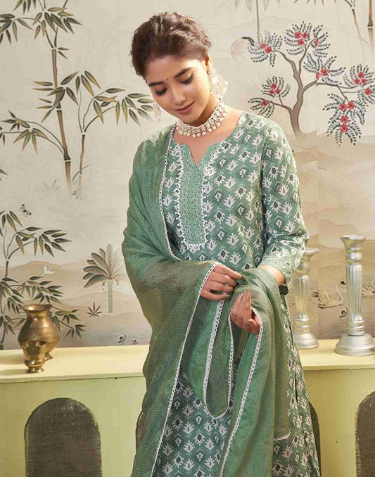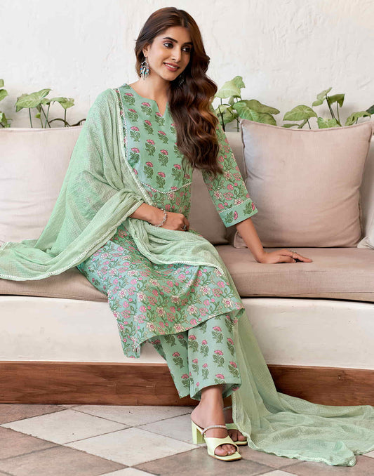 Pista Green Printed Cotton Straight Kurta Set With Dupatta
