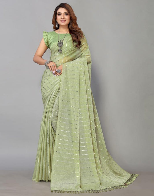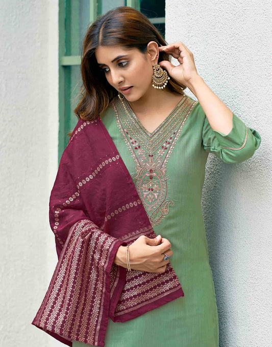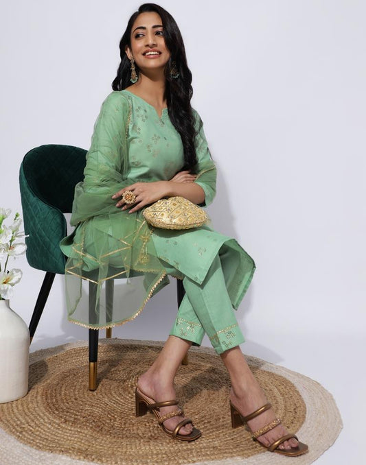 Pista Green Sequence Cotton Straight Kurta With Pant And Dupatta