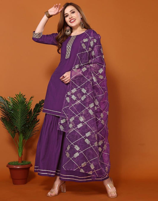 Purple Chinnon Embroidery Sharara Suit Kurti With Pant And Dupatta