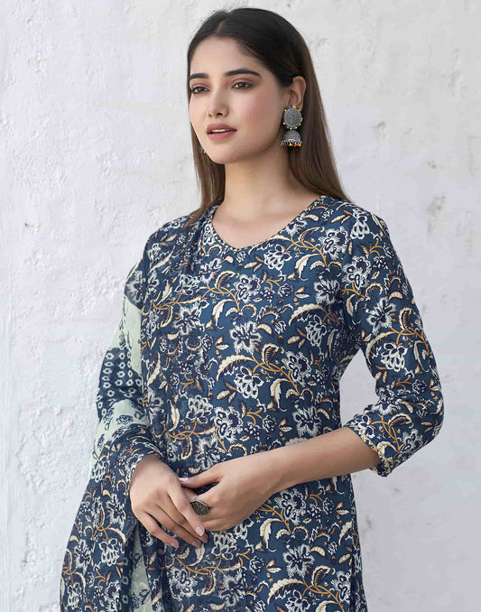 Rama Blue Printed Rayon Straight Kurta With Pant And Dupatta