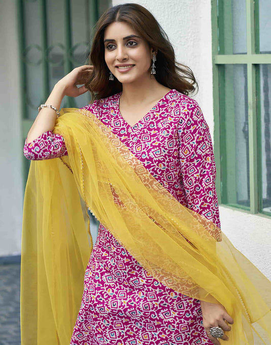 Rama Pink Printed Cotton Straight Kurta With Pant And Dupatta