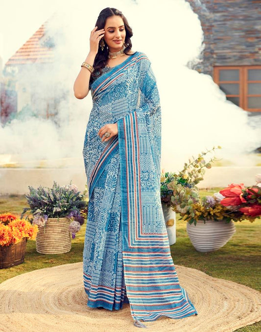 Ready to Wear Blue Cotton Printed Saree
