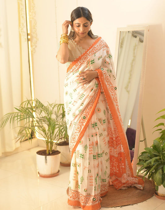 Ready to Wear White Printed Cotton Saree