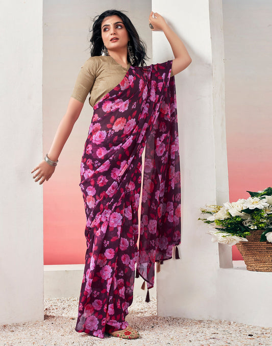 Ready to Wear Wine Chiffon Printed Saree