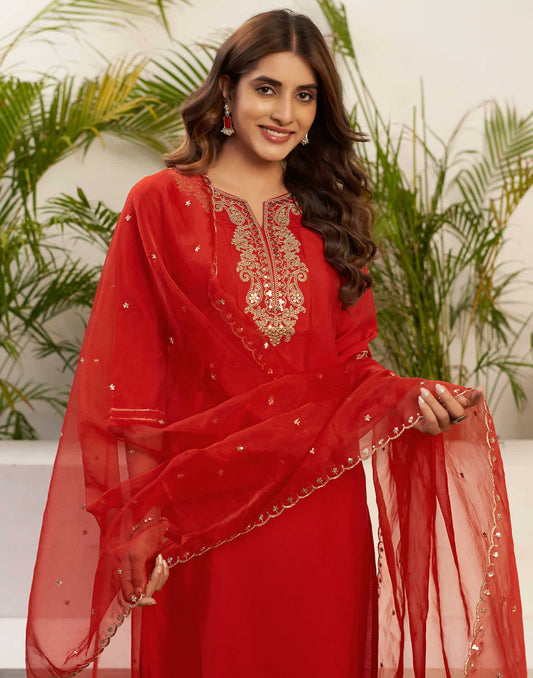 Red Sequence Silk Straight Kurta With Pant And Dupatta