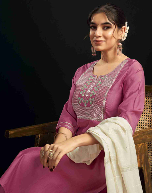 Rose Pink Silk Embroidery Straight Kurta Set With Dupatta