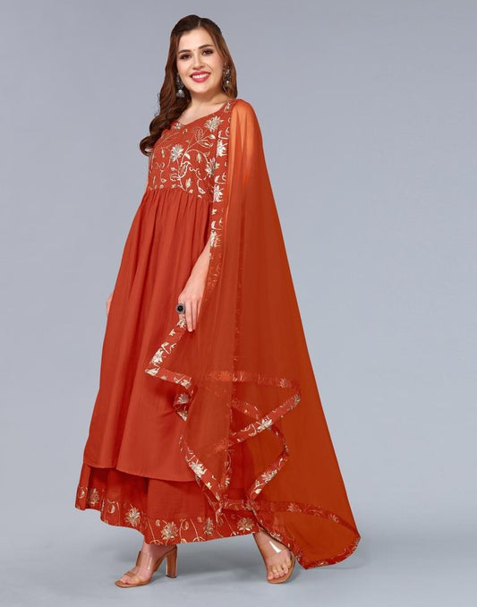 Rust Orange Embroidery Chinnon A-Line Kurta With Pant And Dupatta