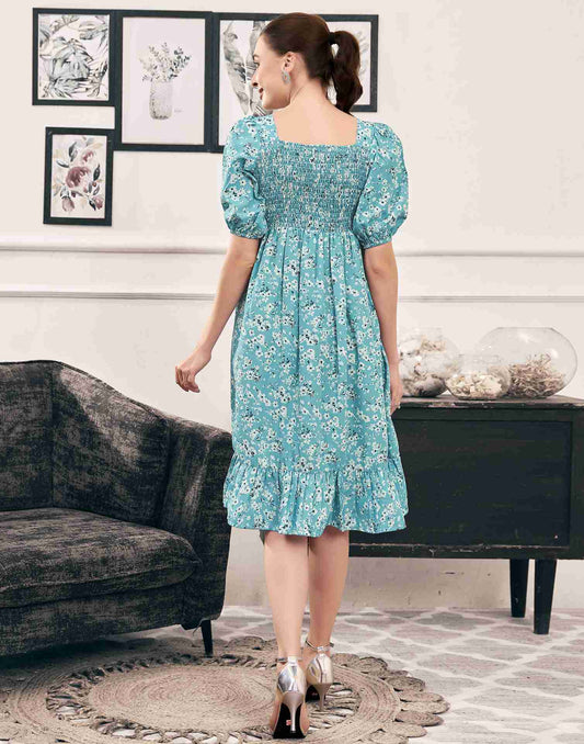 Sky Blue Polyester Printed Flared Dress