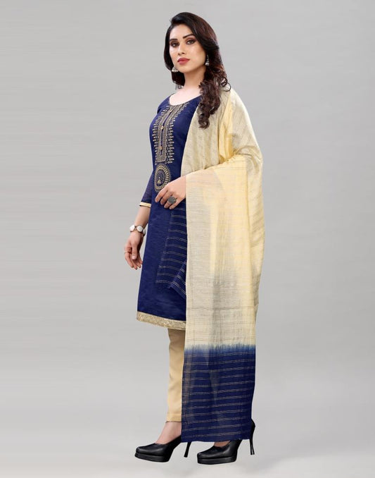 Splendiferous Navy Blue Chanderi Silk Embroidered Unstitched Salwar Suit