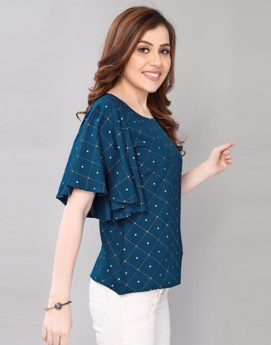 Regular price Rs. 439.00Regular priceUnit price / perRs. 0.00Sale price Rs. 439.00Teal Blue Coloured Foil Printed Rayon Top