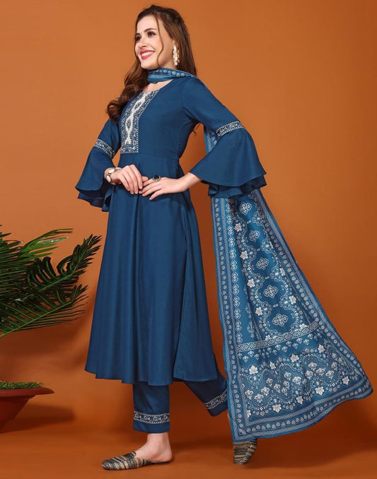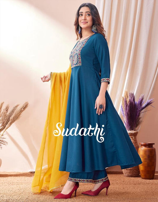 Teal Blue Embroidery Cotton Flared Kurta With Pant And Dupatta