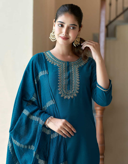 Teal Blue Embroidered Kurta With Pant And Dupatta