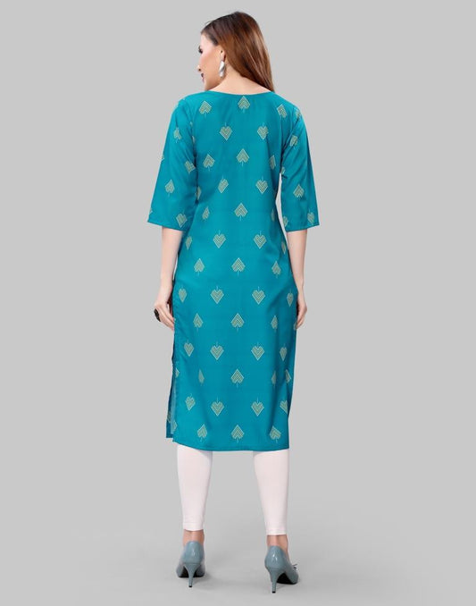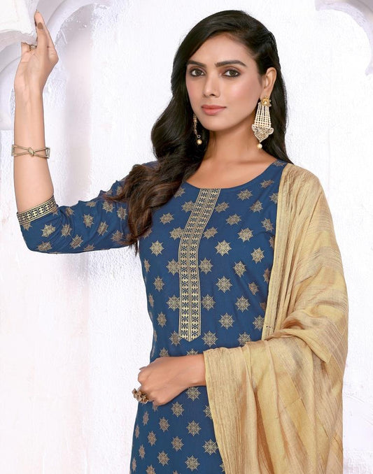 Teal Blue Foil Prined Kurta With Pant And Dupatta