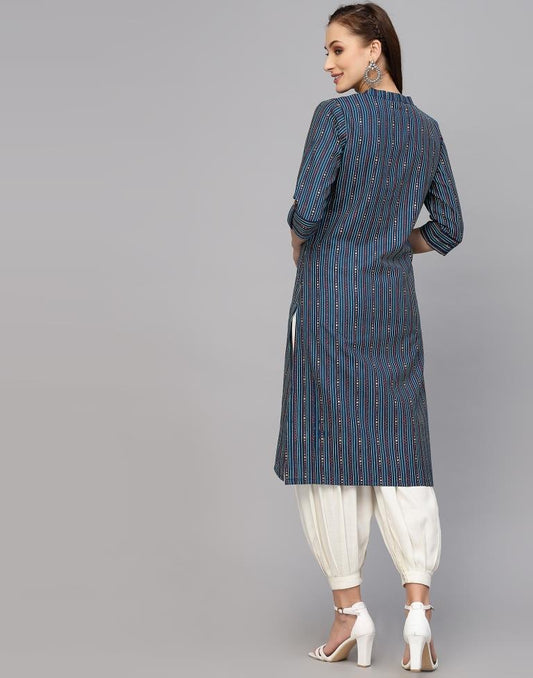 Teal Blue Printed Cotton Straight Kurta