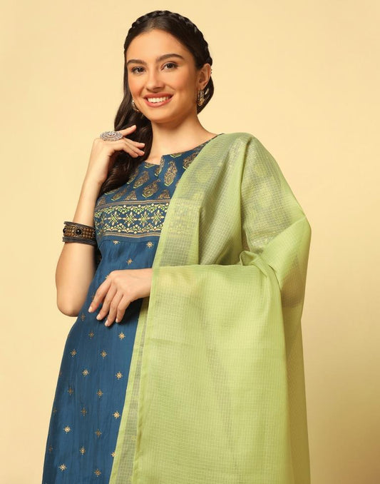 Teal Blue Printed Kurta With Pant And Dupatta
