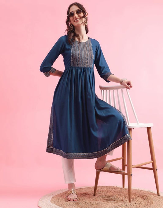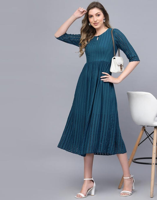 Regular price Rs. 929.00Regular priceUnit price / perRs. 0.00Sale price Rs. 929.00Teal Blue Rayon Embroidery Flared Dress