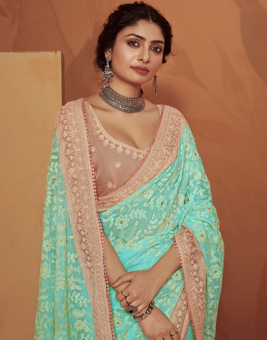 Turquoise Printed Chiffon Saree