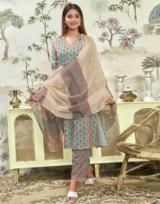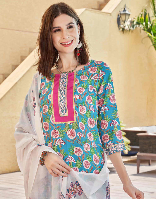 Turquoise Printed Rayon Straight Kurta With Pant And Dupatta