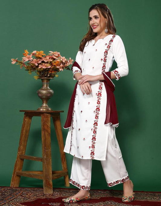 Regular price Rs. 1,069.00Regular priceUnit price / perRs. 0.00Sale price Rs. 1,069.00White Embroidered Kurta With Pant And Dupatta