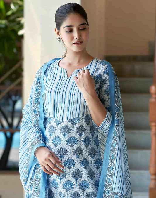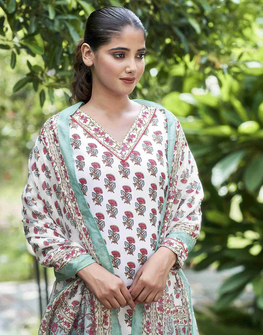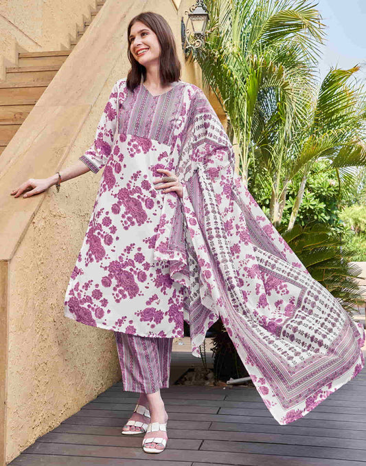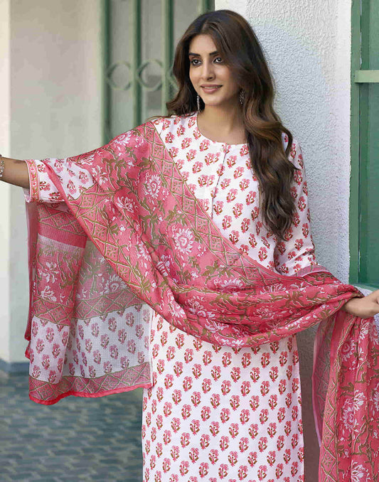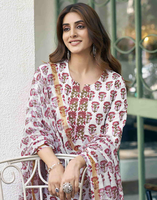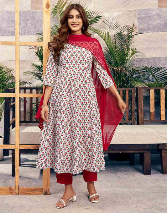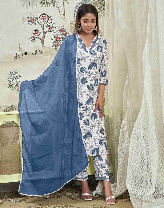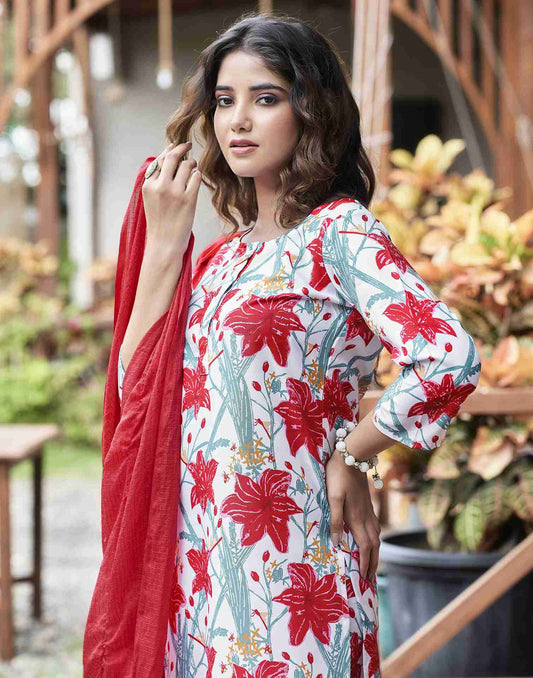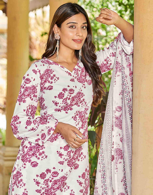 White Printed Rayon Straight Kurta With Pant And Dupatta