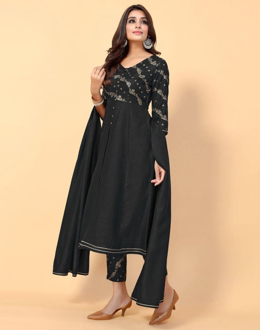 Black Printed Silk A-line Kurta With Pant And Dupatta