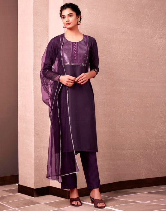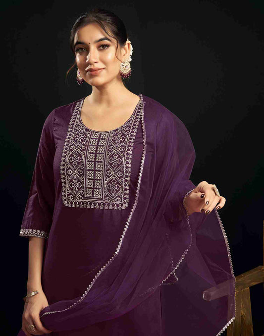 Wine Cotton Embroidery Straight Kurti With Pant And Dupatta