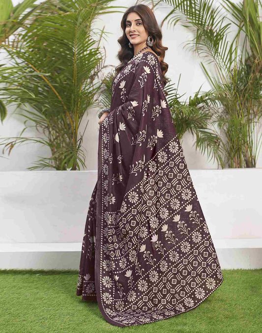 Wine Coloured Poly Cotton Printed Saree